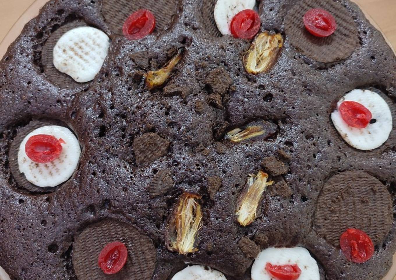 mixed batter, in between pour your dry fruits, nuts then, on the top place oreo biscuit add your wish dry fruit bake it micro, oven 900 c for 12 to 14 minute. if you are going bake in, a oven then, your temparature should be 180c for 35minute.